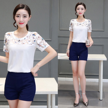 2016夏季新品時(shí)尚套裝韓版印花蕾絲拼接雪紡衫短褲兩件套女 /
