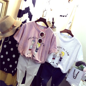 搞怪吵架猜拳小人字母印花寬松竹節(jié)棉短袖T恤女 /