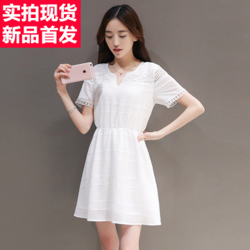 2016夏裝新款女裝韓版純色V領(lǐng)蕾絲拼接短袖連衣裙子 /