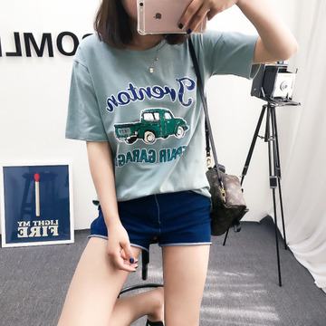 2016夏季新款韓版女裝女式印花小汽車(chē)T恤短袖純棉打底衫一件代發(fā) /