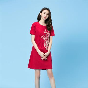 【實(shí)拍】新款夏文藝棉麻大碼短袖中長款刺繡連衣裙 /
