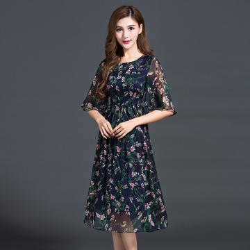 2016春裝新品修身五分袖大擺印花真絲連衣裙長裙女 /