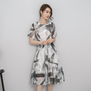 夏新款韓版時(shí)尚修身圓領(lǐng)短袖顯瘦印花歐根紗中長款連衣裙 /
