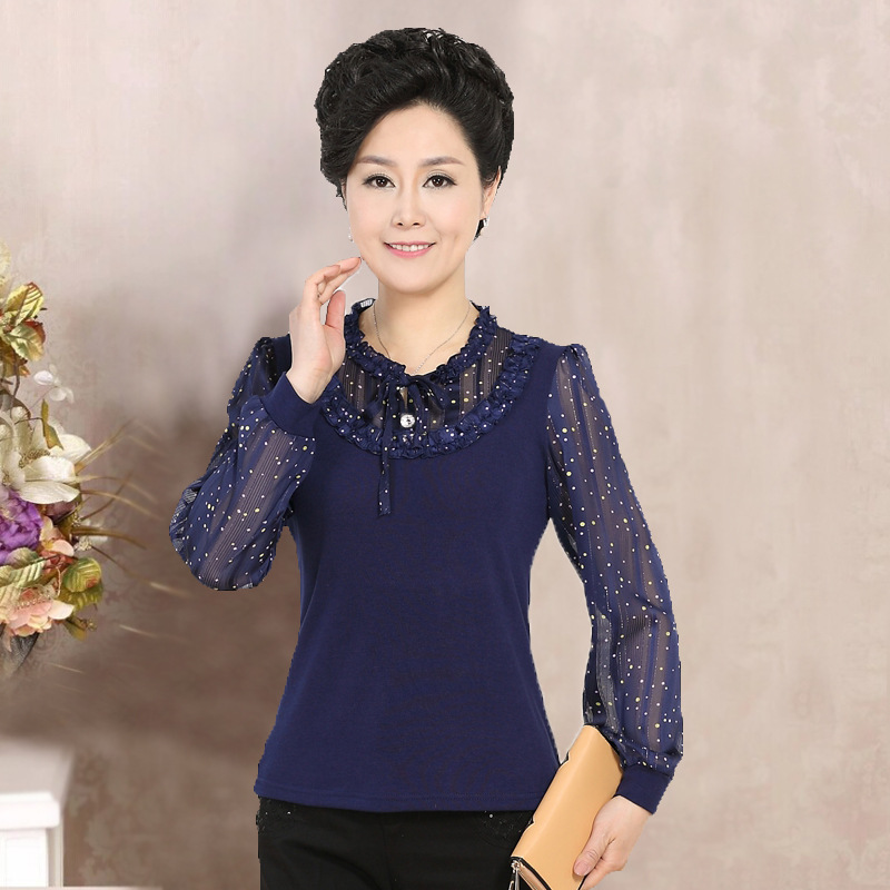春秋新品媽媽裝雪紡衫中老年女裝長(zhǎng)袖t恤老年人襯衫中年小衫打底 /
