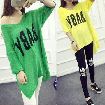 2016夏季韓版大碼女裝 字母提花鏤空V領(lǐng)中長款針織衫T恤 連衣裙 /
