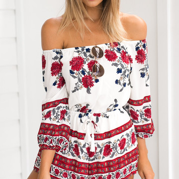 2016夏季新品女裝連體褲 歐美時(shí)尚一字領(lǐng)印花抽繩系帶連體短褲 /