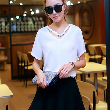 2016夏季新款韓版女裝顯瘦V領(lǐng)雪紡小衫T恤上衣雪紡衫短袖 /