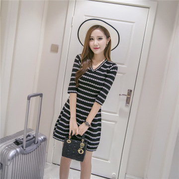 初秋新款韓版顯瘦圓點條紋五分袖針織連衣裙女 /
