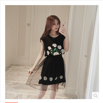 夏裝新款中長款連衣裙假兩件套休閑網(wǎng)紗直筒裙 /