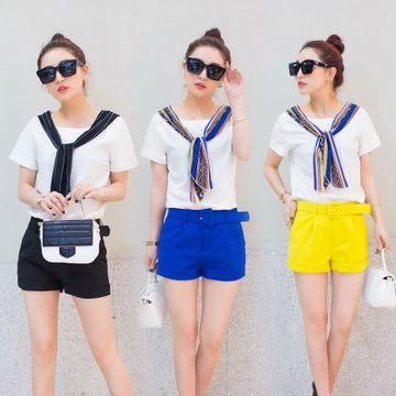 新款韓版熱銷小香風T恤+修身顯瘦腰帶短褲兩件套女 /