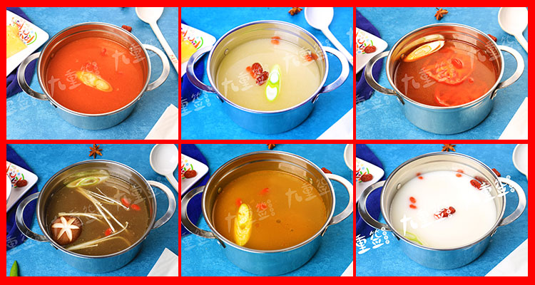 菠蘿鍋底、番茄鍋底、雞湯鍋底、菌菇鍋底、咖喱鍋底、鮮椒鍋底、麻辣鍋底、牛骨鍋底